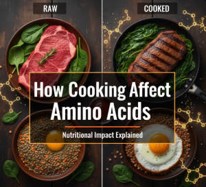 Some amino acids are made more readily accessible to your organism through cooking due to breaking down protein structures. Nevertheless, some of the amino acids can be destroyed by too much heat. Most protein foods should be cooked in moderation.
