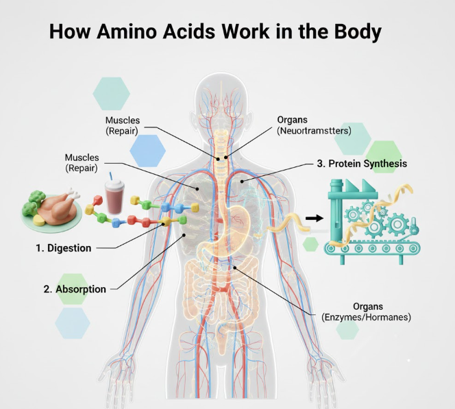 Amino acids may sound technical, but their job in your body is actually very simple. They help build, repair, and run almost everything inside you. From muscles to the brain, from skin to immunity — amino acids are always at work 🧠💪
