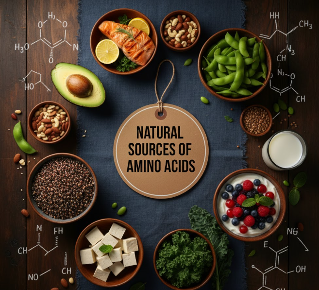 Eggs, fish, chicken, beef, dairy products, soybeans, quinoa, legumes, nuts and seeds are the optimal natural foods. Animal food will provide all the necessary amino acids, and most of the vegetable sources require combination during the day to achieve full nutrition.