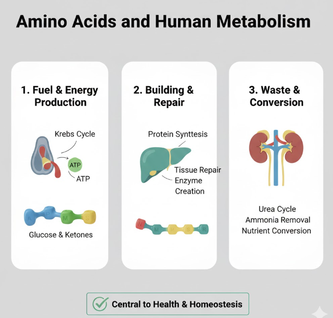 The relationship between the amino acid and the human metabolism is a beautiful dance that will keep you alive and healthy. On a daily basis, your body breaks the proteins ingested down, takes the amino acids to construct new proteins and burns some of these to provide energy where necessary.