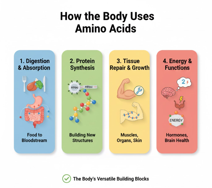 The mechanism of utilizing amino acids by your body is one of the most beautiful systems in nature. Since the time you put protein in your mouth until it is converted to muscles, enzymes and brain chemicals, amino acids are the sources of numerous vital processes.